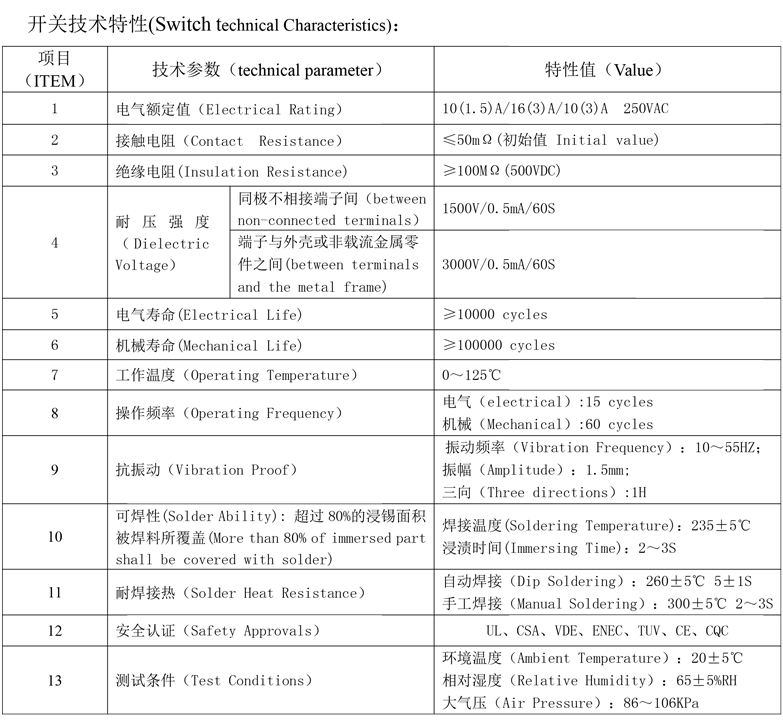| 1 | विद्युत मूल्याङ्कन | 10(1.5)A/16(3)A/10(3)A 250VAC | |